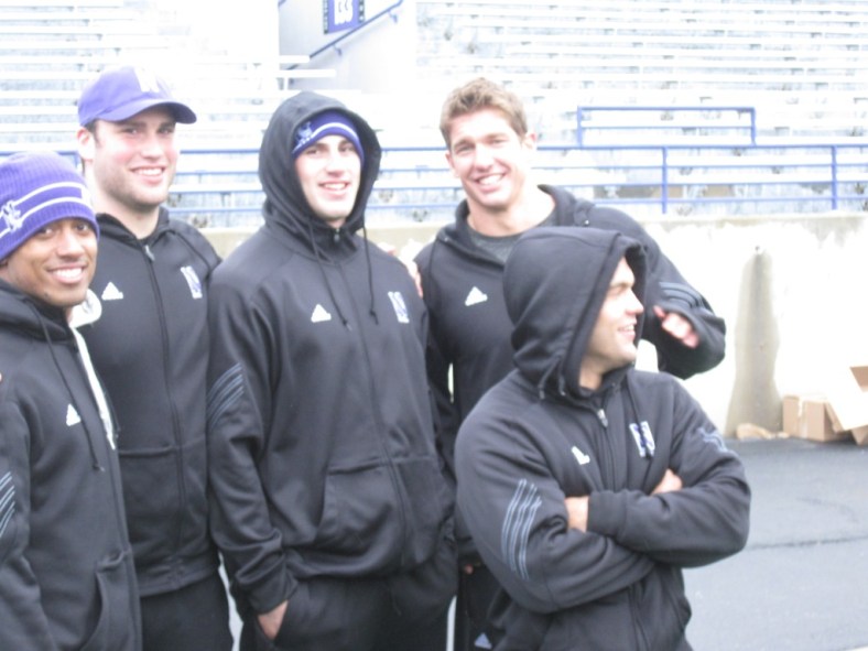 Dan Persa’s Mother made him wait with his fellow rising Seniors long enough for her to snap a photo. As soon as she was done, Dan bolted (just before this picture was taken). Jeremy Ebert is watching his QB sprint towards warmth.