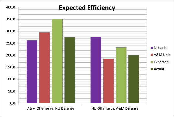 Each individual unit’s efficiency rating (purple and burgandy) is geared to show performance against an average team… since A&M’s offense is above average, and NU’s defense is below average, a much higher efficiency output was expected by the model (light green bars). NU’s defense held A&M’s offense under the model’s expectation and below A&M’s average season output; the NU offense did not rise to the expected level of output, though did outpace what A&M’s defense allows on average (dark green bars).