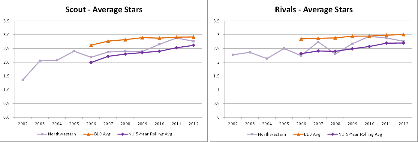 The charts below show how NU’s average recruiting rating over time compares to the average for the other 11 Big Ten schools (Nebraska is included throughout as a Big Ten school – not just in 2011). The shorter lines show a 5-year rolling average of NU’s recruits, or Rolling Recruiting Rating (RRR). This both smooths the raw annual ratings and illustrates the talant amassed in any particular season.