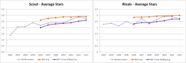 What’s also clear (tho moreso for Scout than Rivals) is that the last three years (’10, ’11, ’12) show a real jump in the annual rating, which is of course driving the upward trend of the RRR. This would seem to solve the chicken-or-egg conundrum of college recruiting: clearly these ratings went up because of the Cats’ success in ’08 and ’09. However, consider some of the other Big Ten teams over the same period (Rivals results only):