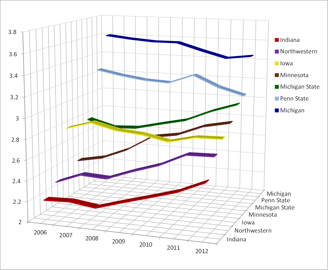 Some of these results are similar to NU — the RRR for Michigan and Penn State have both tailed off in recent years, while Michigan State has shot upwards. Iowa seems to be languishing, despite having a slightly better record than NU since 2007. And most surprising are the increases at Minnesota and Indiana! We all know there are no wins to back up or explain either of those increases.