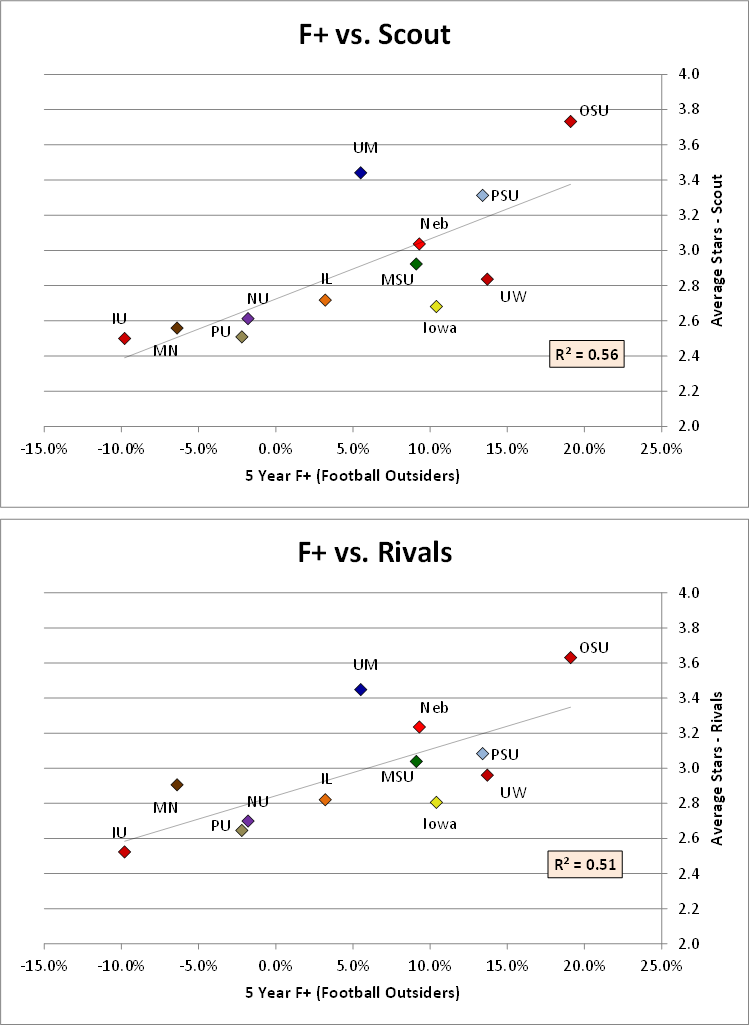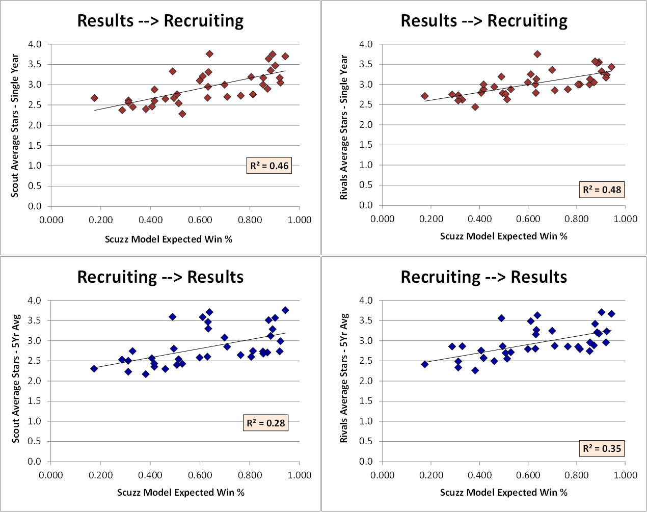 The charts with red data-points show how the Scuzz model’s expected winning percentage during a season correlate to the raw recruiting ratings on the following signing day (i.e. 2011/12 season –> 2012 signing day). The blue charts show how the RRR correlates to performance in the 5th year of that average measure. The red-data shows a much stronger correlation, represented by the r-squared value on each chart. At this point, these data are for the Big Ten only, but I will be expanding this analysis to the BCS in future posts,. Based on this first cut, it seems that performance drives recruiting, more than the other way around.