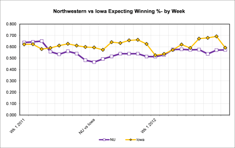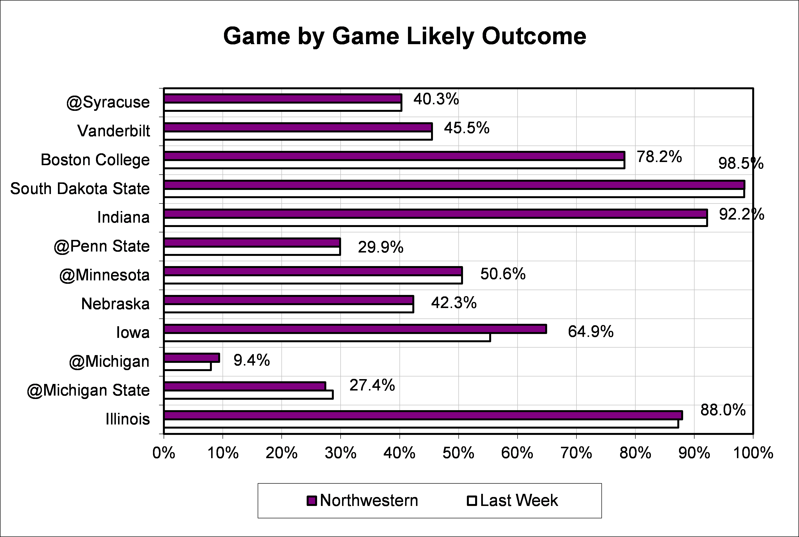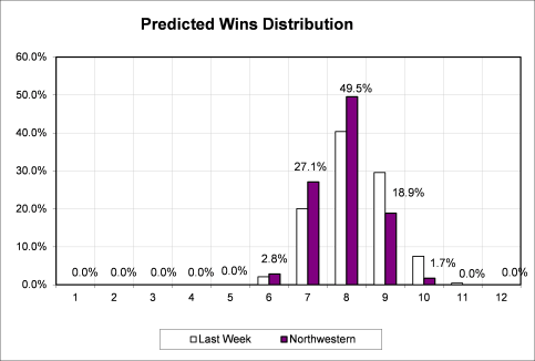 From an efficiency standpoint, little damage was done to NU’s game by game projections – the Iowa game jumps to 65% likely win, due mostly to Iowa’s hideous performance last week. NU’s other games are largely unchanged.