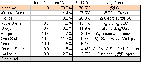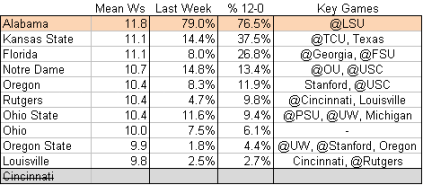 Another one down… Cincinnati falls off the truck (inexplicably, I might add). With their win last week, K-State is looking like the odds-on favorite to meet Alabama for the title. They still have a couple tough matchups, but given the inconsistency of TCU’s defense and the absence of any defense from Texas, the Wildcats just need to avoid an Oklahoma-State-type collapse (too soon?). However, should Oregon or Notre Dame avoid a blemish, I have to think K-State would get leapfrogged in the BCS standings.