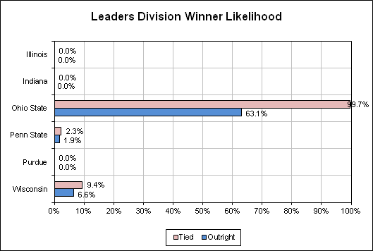 No real surprises other than the terrible state Michigan State is in. They are particularly hurt by the loss to Michigan, who would have to lose twice more for State to overcome them (whereas we only need to beat Michigan and win out). On the other side, OSU is a lock to pull out that division, while Wisconsin still looks like the best bet for second place despite needing to travel to PSU and host the Buckeyes. With their QB Stave out now, I think the Badgers will be hard pressed to pull off anything more than a backdoor trip to the B1G Title game.