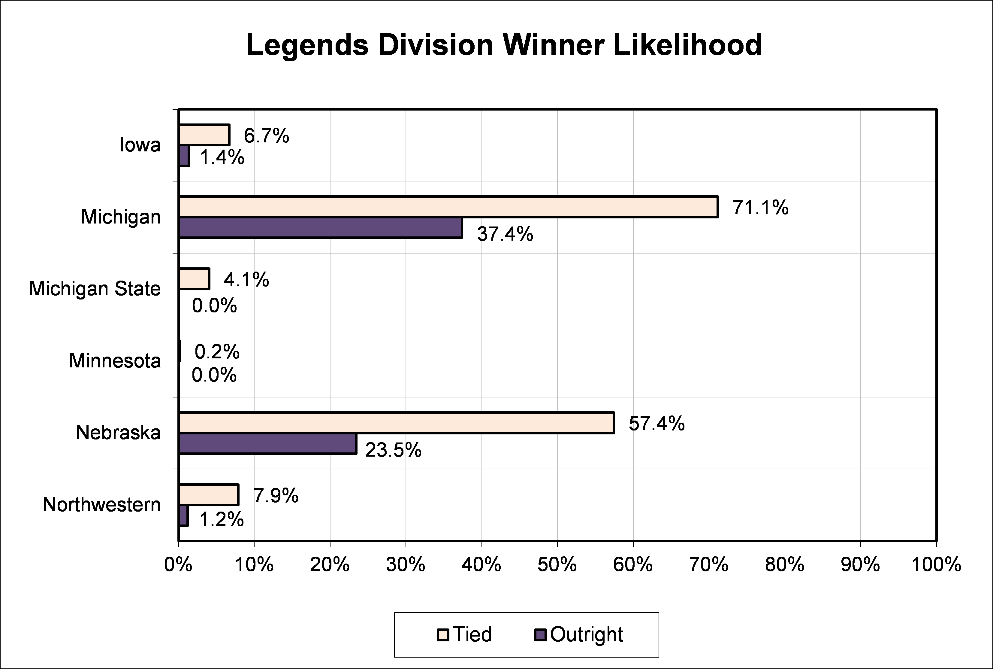 Northwestern’s B1G title picture is not rosy. The problem: Nebraska. They need to lose twice and the Cats need to win out. Only about 2% of the time does the model return a scenario where the Cats finish ahead of Nebraska in the Legends. However, you’ll recall from my post earlier in the week that the model also only gives NU a 15% chance of beating Michigan. If we limit to scenarios where the Cats win 6 conference games (i.e. win out) there is a 41% chance of finishing higher than Nebraska. As such, our fate may not entirely be in our hands, but is within our grasp.