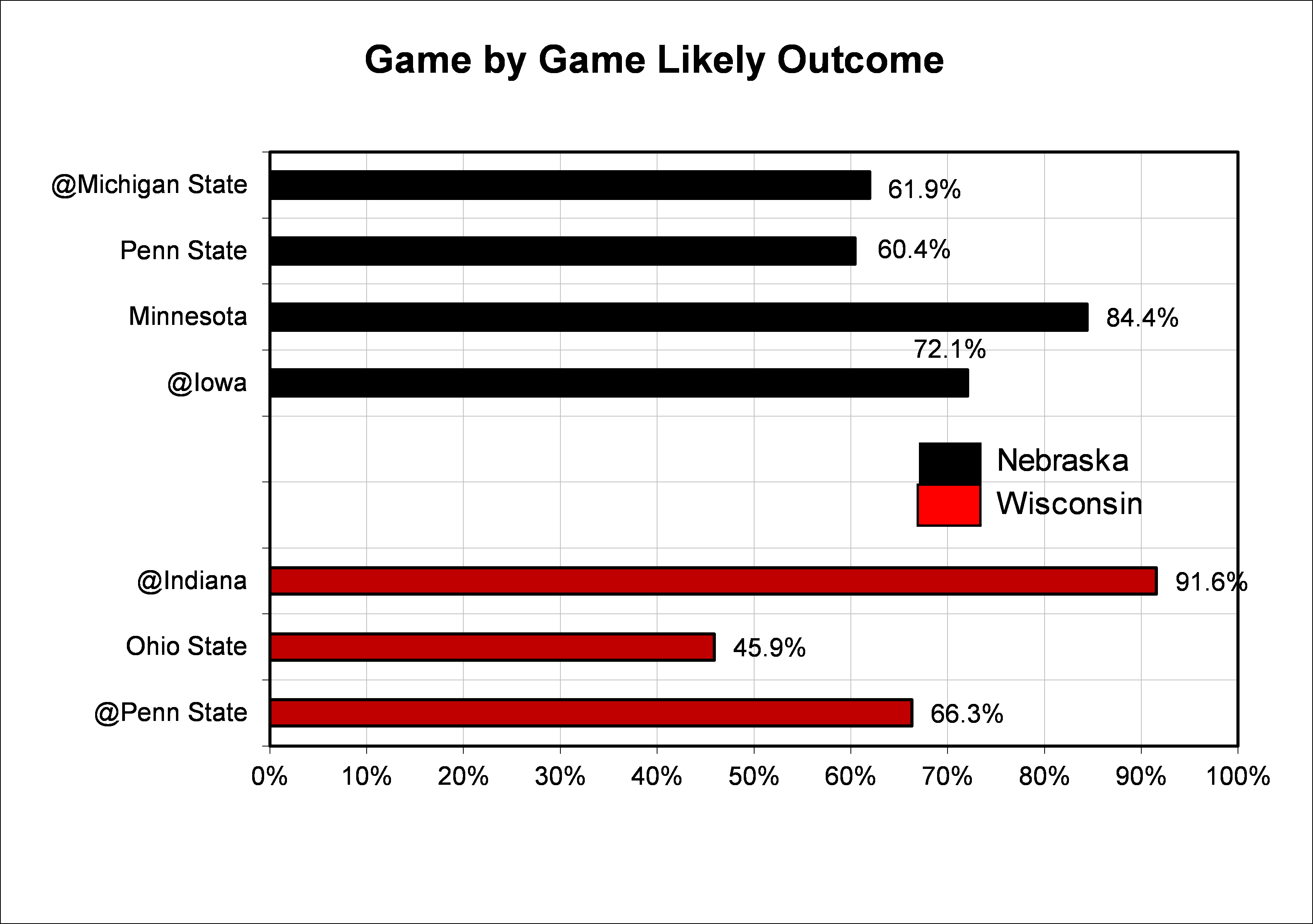 Lastly, let’s look at how our favorites – Nebraska and Wisconsin – shape up for the rest of the year, game by game: