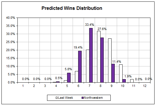 This week, with Colter back, I expect the Cats to play better, but still to be relatively run-focused and conservative. NU’s base offense has had success against Iowa in the past, and will need to find itself this weekend. Unfortunately, the model is no longer very optimistic regarding the Cats, and has dropped the win expectations down to 7 games. The model thinks the Cats and Hawkeyes are even teams, but gives Iowa the nod based on home field advantage.