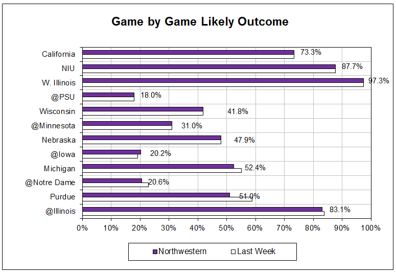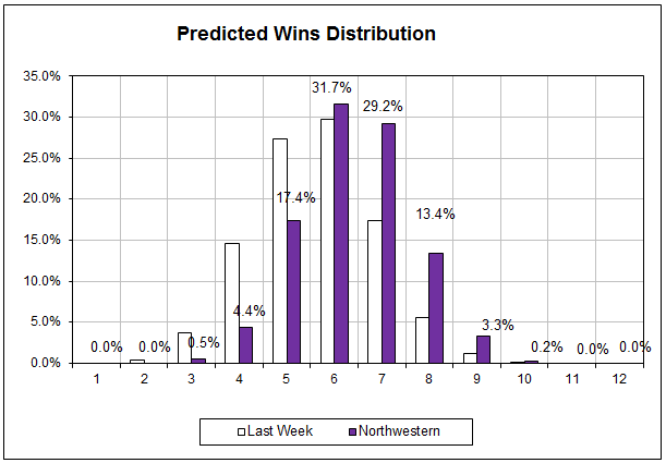 NU’s stats improved dramatically last week, buoyed in part by the utter collapse in Ann Arbor. The simulation now gives NU a 54% chance of getting to 6 or more wins and becoming bowl eligible.