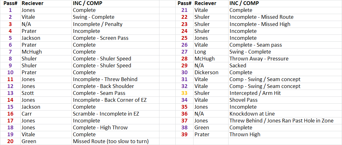 The seam pass to Trevor’s left is one of the best he throws, and the coaches are doing a good job scheming options to play seam passes, slants, bubble screens & flat passes off one another. All that activity has given Trev some real opportunities downfield as well. Generally, based on the last three game charts, Trev is much more comfortable throwing to the left side of the formation – be it that seam, or when he throws the deep ball 30+ yards downfield (those have almost all been to the left.) If his percentages on boundary throws improve, that will really elevate this offense – that was where he had a lot of success against NIU, but perhaps the bigger faster corners in the Big Ten will ultimately foil those passes; he hit two early against PSU, but was not able to connect after those first two drives. Here is the passing chart for the PSU game: