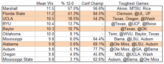The last two weeks have certainly complicated the Ohio State vs. Alabama match-up everyone was sure of at the beginning of the year. Alabama remains the most likely power-5 team to finish unblemished as the usual cast of SEC contenders keeps tripping up, though there is at least one giant red-flag remaining on the schedule. Between Auburn’s woeful O-line performance and LSU’s face-plant in Starkville these past two weeks, the only date I’m worried about is when the Tide travel to Starkville themselves. Bama still goes into the SEC championship game at 12-0 in 40% of our simulations, down from 52% last week. No other SEC teams are undefeated in more than 1% of simulations, but if Mississippi State survives the next two weeks, they will be on the board.