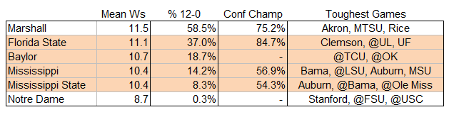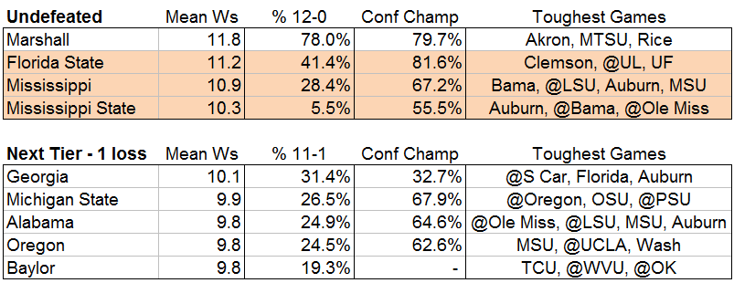 Darkhorses? Sadly, there are few candidates. The four-team playoff and the Power-5 have seen to that. South Florida could end up going undefeated, but doesn’t play anyone of merit (Illinois!). Boise has already lost, and while the model likes San Diego State (42%), UTSA (34%), and Memphis (33%) to win out, none of them have the path that would really garner consideration from the playoff committee. San Diego State is the closest but needs Stanford go on a run in the Pac-12. Should we get some upheaval, one of these teams could see a miracle, but I think two teams from the same Power-5 conference is more likely. A Michigan-Penn State ordeal could have potential. A 1-loss Mississippi State or Georgia as SEC runner-up is always a possibility. If USC lost a really close game to Washington, I could see both getting in. Oklahoma St-OU as two 12-1 teams? Could setup a 3rd game between them this year though. Regardless, it appears to be a lot of familiar team names – the most interesting story is probably Oklahoma State which has come oh-so-close twice in the last five years.