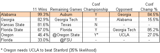 Since there’s not much here, let’s look at who else has a chance, should ND fall to USC, or something crazier. Alabama has clearly the best shot to retain their position, with a 99% chance this weekend, and then an 85% chance in the SEC title game vs. Georgia. Oregon’s chances of getting back in the mix are predicated on Stanford losing to UCLA (35% chance)… that, plus a tough matchup vs. OSU puts the Ducks on the outside looking in. KState similarly has too much ground to make up (Texas losing tonight didn’t help). Florida State, however, is well positioned with a home game vs. the inconceivably 4th ranked Florida Gators. Should FSU win, and go on to win a heavily favored matchup with GT in the ACC title, they would be next in line should ND or the SEC falter (the latter would require Alabama or Georgia losing this weekend, and then the loser beating the other in the SEC championship). There are also some options for Florida to back into the game as well, like Alabama did last year. To knock the SEC out entirely… prob need GT to upset Georgia, then Georgia to beat Bama, plus an FSU win over Florida.