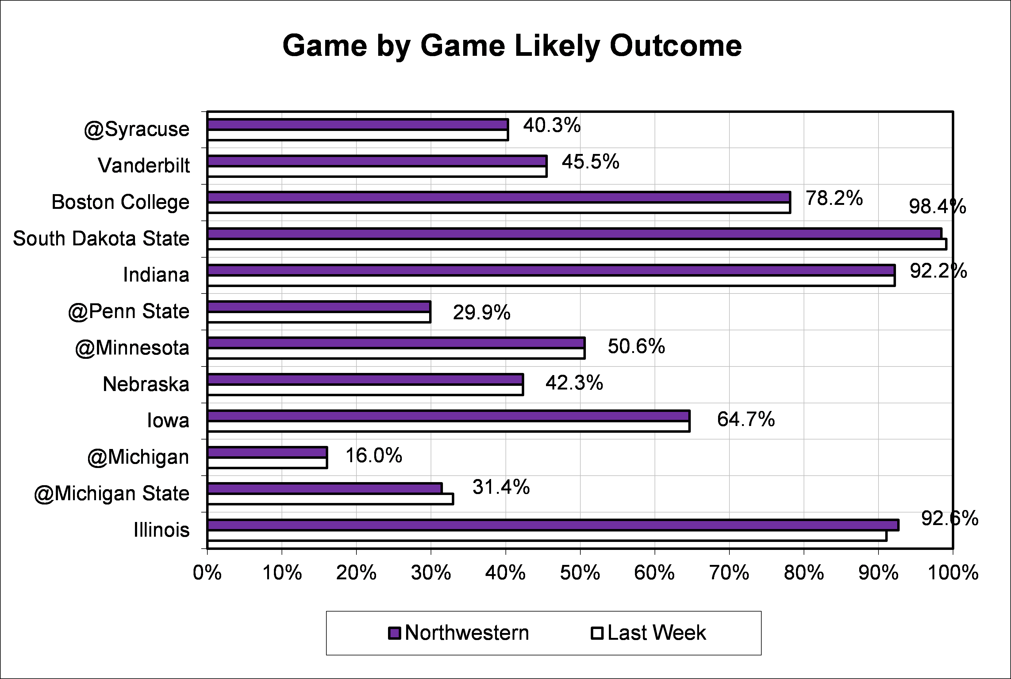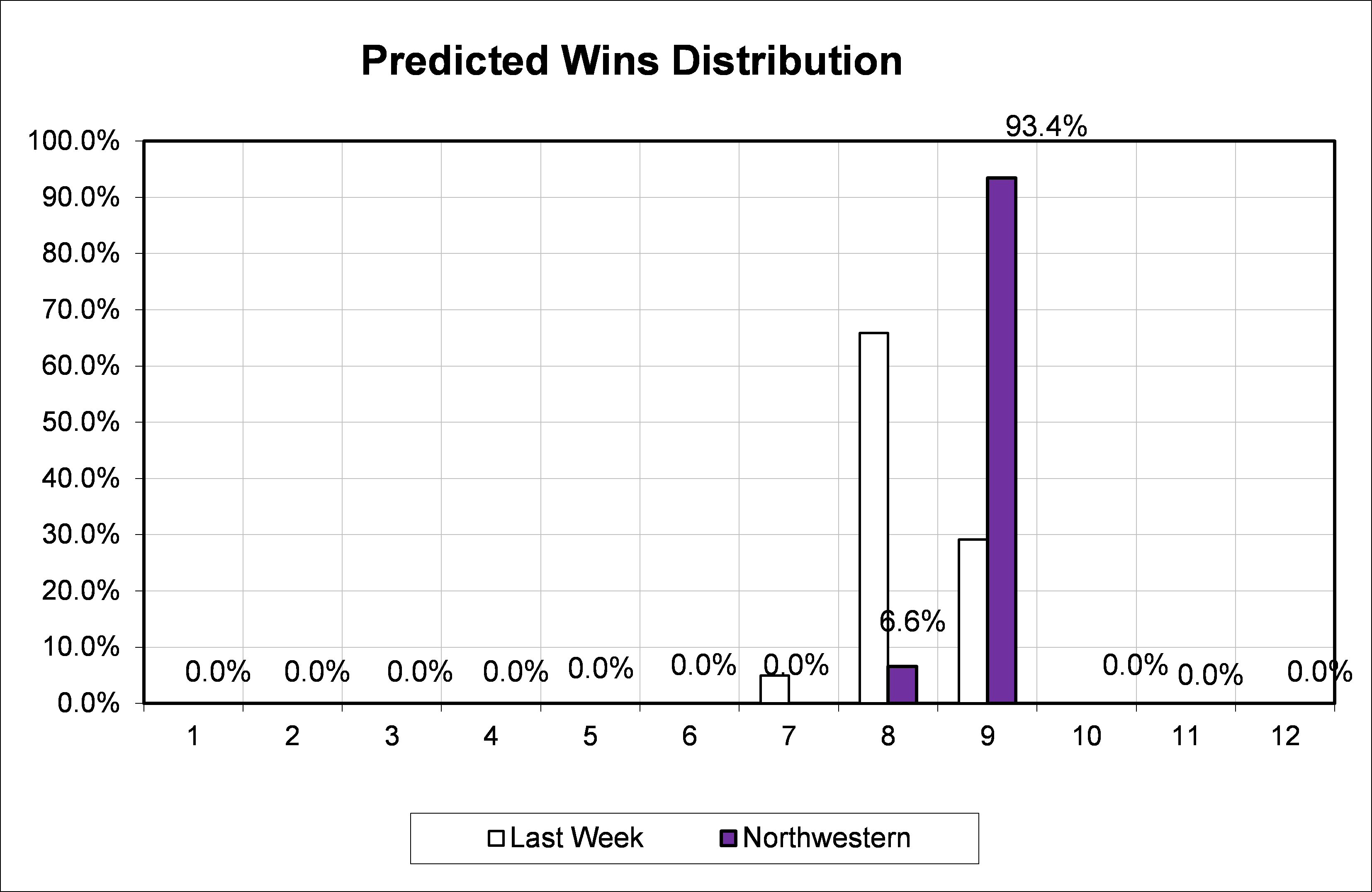 The model has loved the IL matchup pretty much since week 3. As Northwestern fans, we all know better than to take this game for granted, and the team & coaches know that as well. One of the nice things about finishing the season with your rival is the added motivation that keeps you honest even in a mismatch… but the other side is motivated too, and they’ll be fired up to put a black mark on NU’s season.