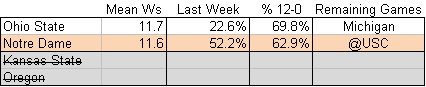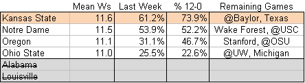 For Oregon (0.1%) or Kansas State (0.8%), the only option is ND loss + SEC implosion, and then they would play probably the winner of FSU-Florida.