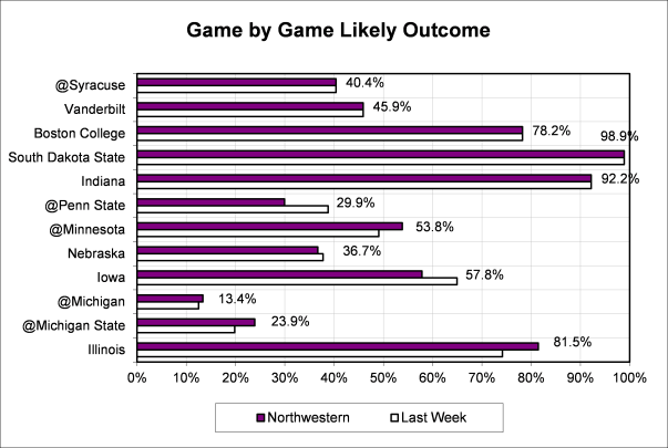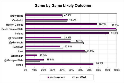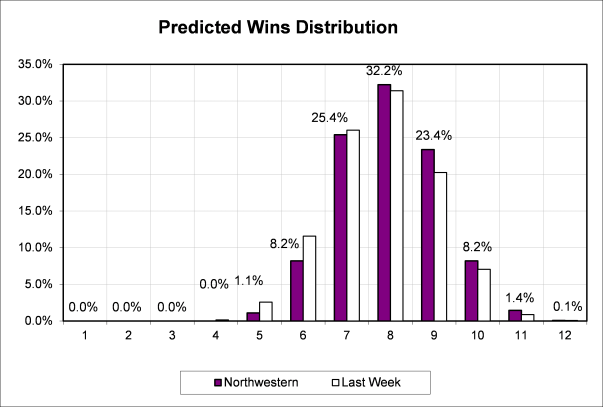 NU’s projection for the year still keys on 7 or 8 wins, while the possibilities at the high-end of the spectrum are way down. This is mostly because Michigan is looking real strong again, so to get to 10 wins the Cats would need to beat them, or sweep all of their other games. That said, a win against MN would shift very close to last week’s results.