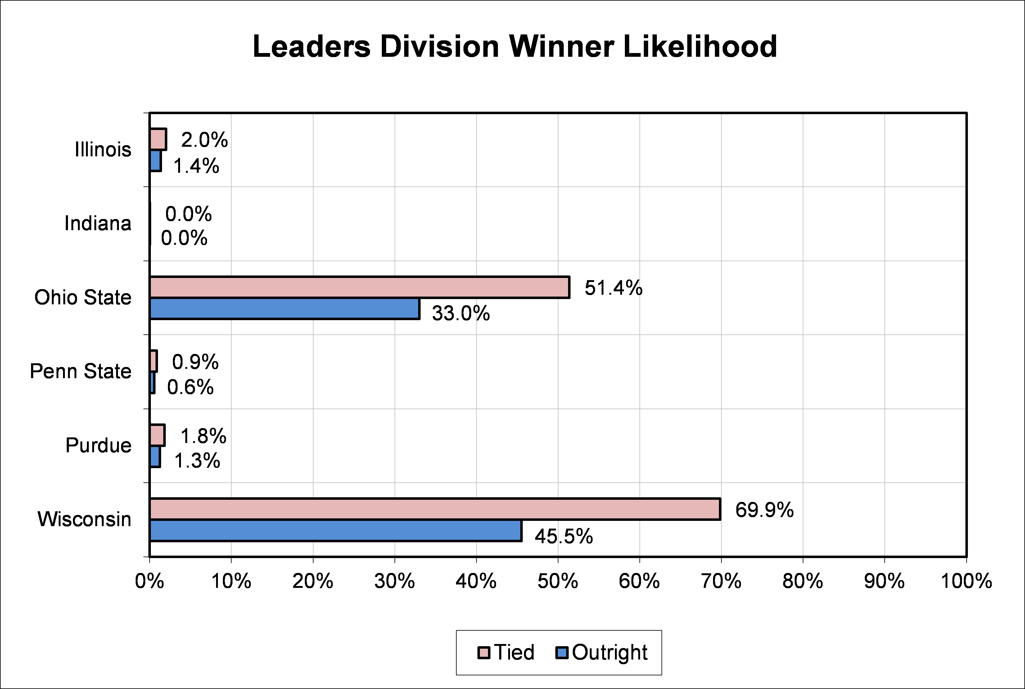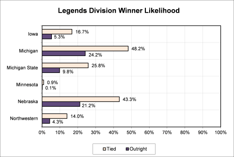 The Legends division still resembles the free-for-all we thought it would be. Michigan and Nebraska are neck and neck, but 5 of the 6 teams have reasonable chances of finishing first. I expect that a Minnesota win this week vs. Iowa would start to move the needle for the Gophers, who have not performed well enough yet to outweigh last year’s disaster ratings.