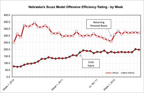 You can also see that now with the UMass game excluded, IU’s profile drops in that 3rd week of 2012 (rather than an increase, we see the offense drop off)…. That is due to an adjustment I made to account for the Tre Roberson injury. Interestingly enough, the following week against Ball State, the offense performed pretty much as the Roberson-adjusted data point would indicate.