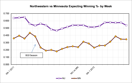 MN never recovered after that drop in 2011… the last third of the season showed some promise (namely by beating Iowa), but the Gophers never really came close to even a 50% expected winning percentage. This year, the team had an even more noticeable rise in performance, particularly in weeks 3 and 4. The Iowa matchup has curtailed that slightly, but even without that loss, MN’s stats are not good. And unlike with Penn State last year, we don’t need any assumptions to create a gap in performance between NU and Minnesota.