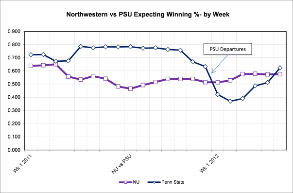 To understand this better, I took a look at how PSU’s expected winning percentage has fluxuated over the last two years, and shown it side-by-side with NU’s winning percentage:
