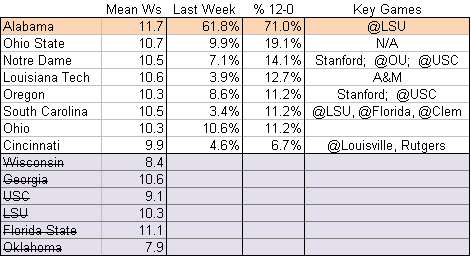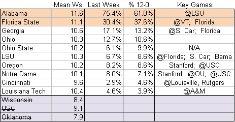 Two more weeks and two more major competitors gone. USC and now Oklahoma have joined the one-loss crowd and two new teams have joined this weekly tracker – Notre Dame and Louisiana Tech. The story here though is Alabama… 75% chance of going undefeated now, which frankly doesn’t seem off – they of course have tough games, but nobody appears to be in the same league as them (and LSU’s tight win over Auburn has really hurt their profile). As for Alabama’s potential opponent? I like Florida State’s chances – they’ve already beaten Clemson, and while the ‘Noles have tough games against Virginia Tech and Florida, the other prime candidates have much tougher matchups; Oregon would be the one team you could argue has an easier road, especially considering Stanford’s loss last night.