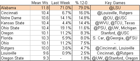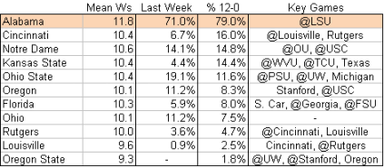 Little change from last week, though Cincinnati enters the fray after their surprising win over Virginia Tech. At risk this week: Georgia, Notre Dame, & LSU. Should either the former or the latter lose, the team that beats them (S. Car, Fla) will probably take their place in this ranking next week. Note the shift in Alabama’s chances is primarily a result of Texas A&M’s rise in efficiency after last week. Do you find West Virginia conspicuous by their absence? They are 50-50 in a bunch of remaining B12 game (dogs vs Texas and OU), mostly on account of their D. A big win this weekend could land them on next week’s list however.