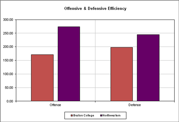 This week the model really likes NU’s chances. BC’s offense had a ton of players coming back in 2012, but they were a really inefficient unit in 2011. Their current offensive efficiency rating is 100 points lower than NU’s, while the defense performs about 50 points better. (Sidenote – for the uninitiated, the Scuzz Model uses offensive and defensive scoring efficiency – points per 100 possessions to rate each teams’ O and D units):